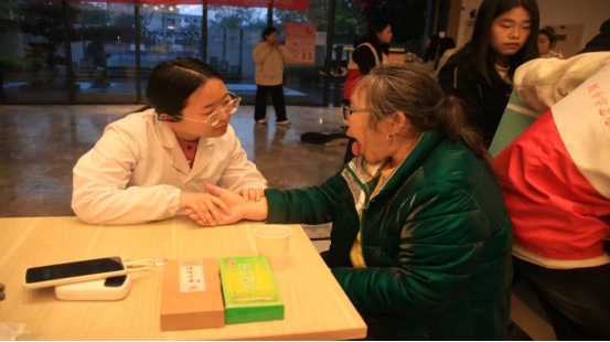 中医义诊区同样备受居民欢迎。康养学院的志愿者们为居民提供免费测血压、中医脉诊、推拿、拔罐、艾灸、耳穴压豆等特色服务,细致辨识居民体质,针对颈肩腰腿痛、亚健康等问题提供个性化调理方案与食疗养生建议。现场还设置中医茶饮品尝、泡脚药包与香囊发放环节,普及中医养生与保健知识,让居民在家门口就能享受到便捷、专业的中医服务,切实感受传统医学的独特魅力。